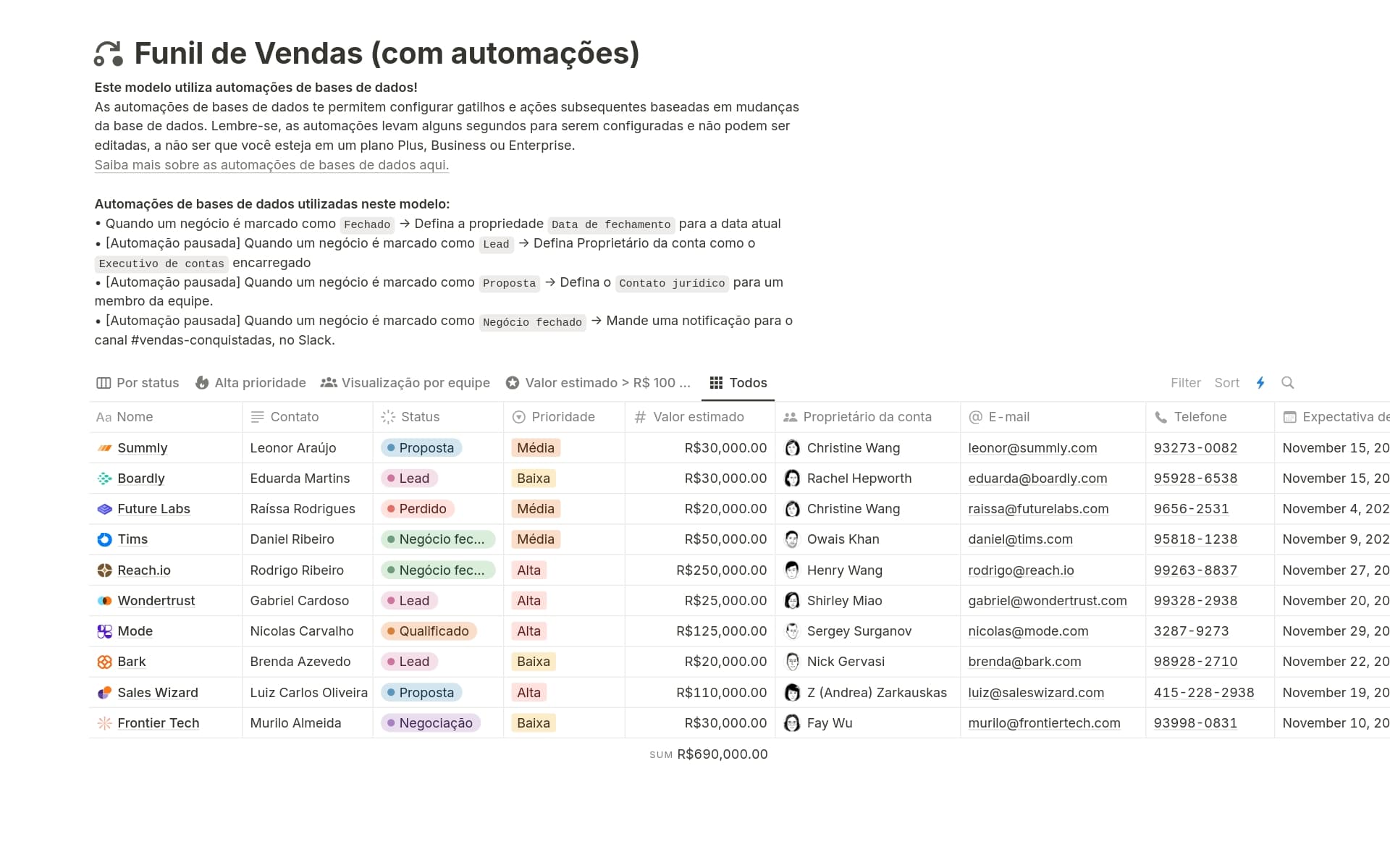 Modelo fácil de mexer, intuitivo e bem organizado. Achei um dos melhores gratuitos que pesquisei. Pra melhorar ainda mais só faltaria adicionar alguns gráficos pra analisar taxa de conversão, quanto de $ tem em cada fase do projeto.G