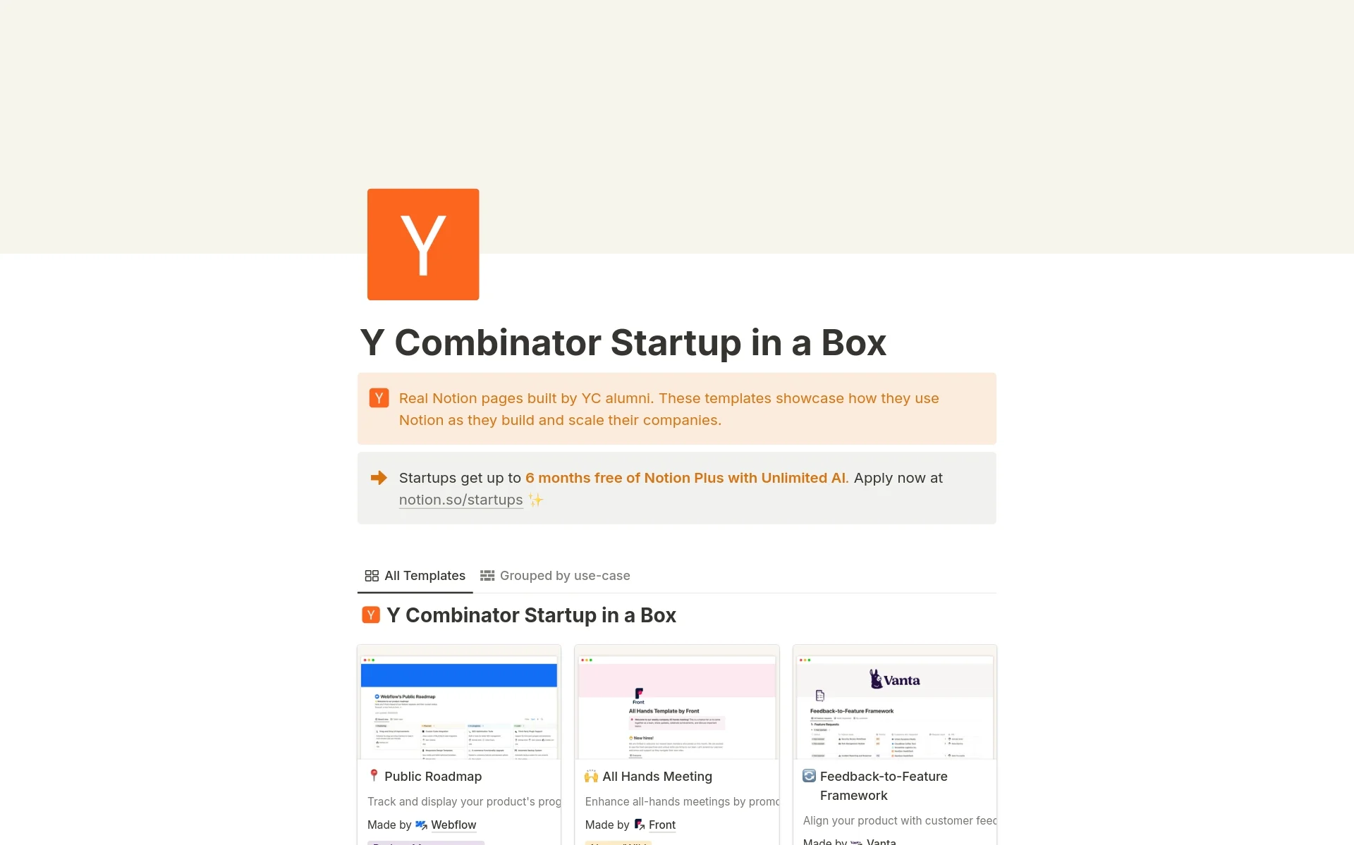 Real Notion pages built by YC alumni. Get your startup off the ground, using templates from Front, Vanta, Deel, Doppler, and others.